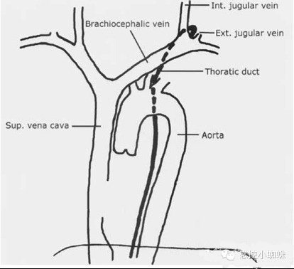 胸导管在左侧颈内静脉和锁骨下静脉交回的夹角注入静脉,左侧颈内静脉和锁骨下静脉穿刺时可能损伤胸导管,造成乳糜胸或者乳糜漏。附件中的一篇文献就是在进行锁骨下静脉置管时将钢丝置入了胸导管,经过CT,胸片和抽出液体甘油三脂的检测结果证实钢丝确实在胸导管中。图1显示了胸导管与其他结构之间的关系。