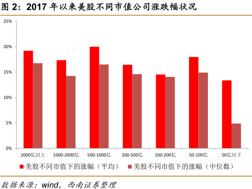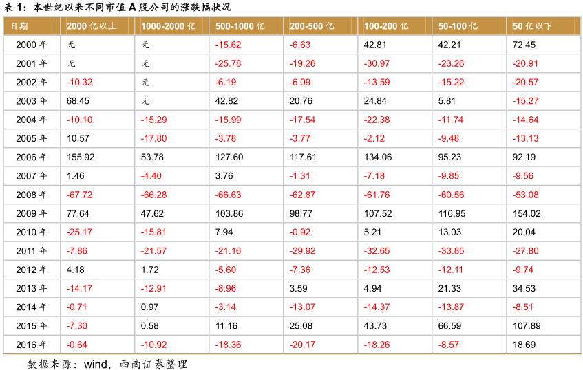 不论是从纵向对比还是横向对比来看,涨跌幅与市值完全正相关并不是一种常态。这不但不是A股历史上的常态,也不是国际股市的常态。从国际比较来看,以美股为例,不同市值区间的公司涨跌幅差异不大,只有当市值低于某一阈值时,公司股价表现才会急剧下滑(图2)。如从平均涨幅来看,2017年以来,不同市值的美股涨幅都稳定在15%左右。而在涨幅取中位数后,50亿美元以下的公司涨幅才显著下降,回到5%左右的水平,而50亿以上市值的各类公司涨幅依然保持在15%左右。从A股自身的历史纵向比较来看,2017年以前,50亿以下的小市值公司,除了2003年,基本每年都保持不错的相对收益和绝对收益,即使是在金融危机爆发的2008年,小市值公司依然取得了最佳的相对收益,而在2009年的大反弹中,小市值公司更以154%的涨幅跑赢全场(表1)。