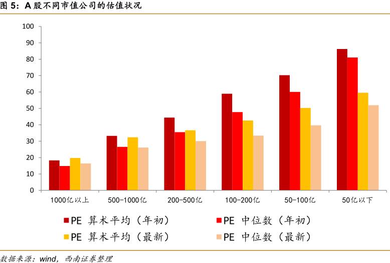 ○从估值上看,A股不同市值的公司与估值存在显著负相关。即市值越大,估值越低,市值越小,估值越高。