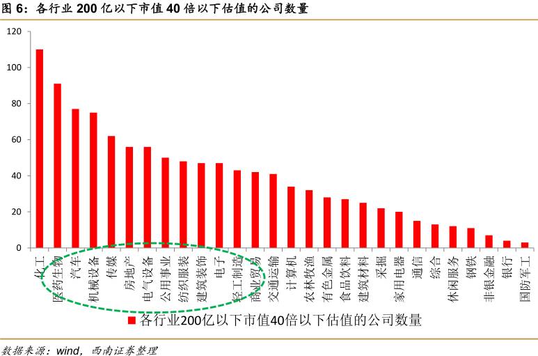 ○当前,A股的中小型公司中,已经出现了一大批估值合理的企业。市值小于200亿的公司中,有1000多家公司的市盈率在40倍以下,在创业板和中小板当中比较集中更加集中。