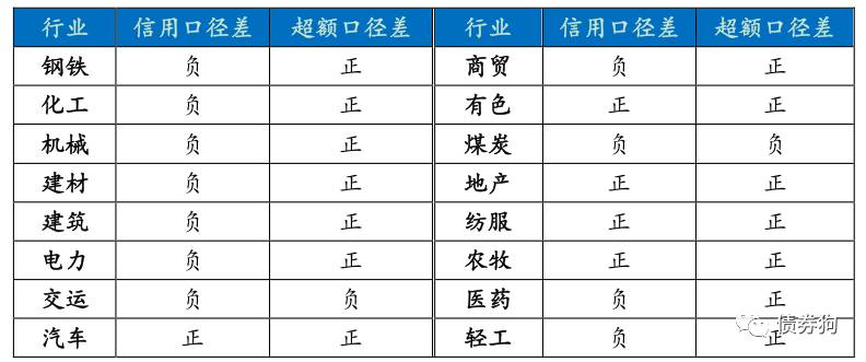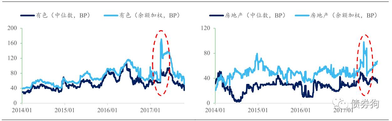 在某一较短的时间内,两种口径的利差走势可能会存在较大的背离。我们认为,对于某行业超额利差,其加权口径忽然与中位数口径产生较大背离,则可能是发生了信用风险事件。单个主体信用事件的发生会大大提高其利差,只要其发债余额不是处于行业中位,那么用余额加权的结果必然会与中位数结果产生偏离,若涉事主体发债余额大,则加权口径会向上背离中位数口径,反之则向下背离。举例来说,今年上半年有色行业的魏桥事件,房地产行业的万达系列事件,都是由于涉事主体在行业中规模较大,导致行业超额利差出现了加权口径短期内向上大幅偏离中位数口径。