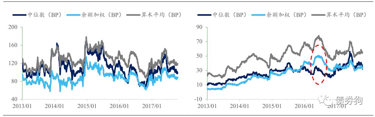 在加权口径中,余额大的主体,其利差对整个指数的影响也较大;算术平均口径虽不受余额影响,但仍会受到极端值的影响;而中位数口径则较少受到个券体量或发行量的影响。通过比较加权口径与中位数口径的长期差异,可以简单直接地判断某类债券的风险分布。