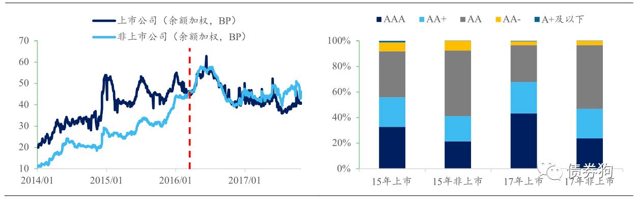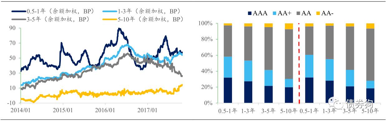 图表2:分期限额利差对比(左)与样本券主体评级分布对比(右)