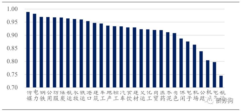 分行业来看,我们计算了主要发债行业2014年以来信用利差与超额利差的“加权口径-中位数口径”,观察其正负号,以此来表征市场对各行业企业规模的认可程度。结果表明,钢铁、化工等多数行业信用利差口径差为负,市场认为这些行业中发债量大的风险相对较小;汽车、有色等少数行业信用利差口径差为正,市场认为这些行业中发债量大的风险相对较大。此外,一个有趣的现象是,除了交运与煤炭,大多数行业超额利差口径差为正。这表明市场认知上,尽管发债规模大的企业风险相对较小,但这些企业的风险相对其评级还是被有所低估。