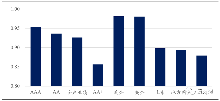 尽管存在数值上的差异以及短期背离,长期来看不同口径利差的走势基本一致。与背离走势表明发生个体风险事件相反,某类利差指数两种口径的走势越接近,表明在该类债券中单个主体的利差变动易扩散到群体,风险的传播性更强。如果用某类利差指数两个口径结果的相关性系数来表征走势是否一致,那么相关系数越大,市场对个体风险事件的知悉更容易演变为对群体风险的应对,同类型债券价格更易“躺枪”受到外发信用风险事件影响。