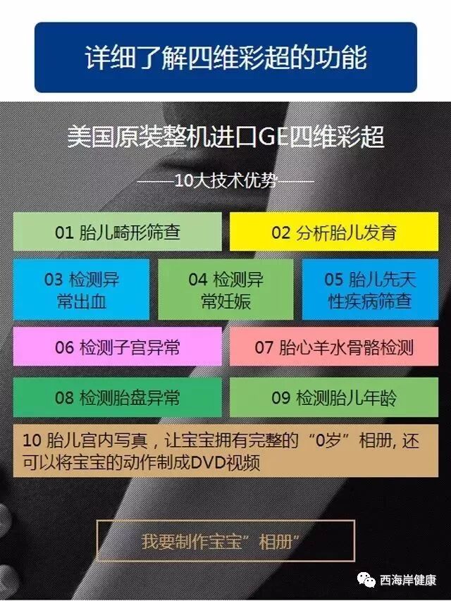 对于孕妈妈们而言,如果有条件,可以在孕早、中、晚三个阶段各做四维彩超检查,对于大部分一般的产妇而言,在孕中期做四维彩超检查筛查胎儿体表畸形即可。四维彩超检查的适宜时间是孕22~28周,建议孕妈妈们在这个阶段做四维彩超检查,提前与医院预约,筛查胎儿畸形,孕育健康的宝宝。