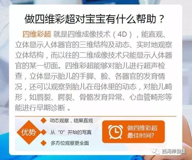 所以我们应该不难为自己做四维彩超的时间选择而发愁了,检查的适宜时机应该是孕22~28周,当然这也不是完全的,很多时候我们还需要更多更分布的时间来检查,这要看你的个人情况由医生来为你决定,关键要及时的咨询,到专业的医院做检查才行。