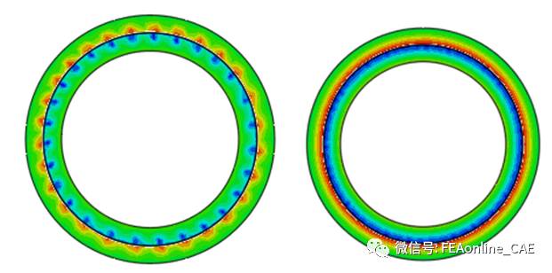 这种离散后的误差,会对接触分析的结果产生影响。即使划分网格时,主从面的节点完全匹配,但是当内外圈存在旋转时,依然会造成接触应力的不连续性,如图2左。
