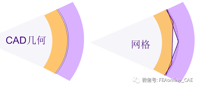 有限元分析是将实体离散为有限的元素,然后以网格进行求解分析。然而对于含有曲面的实体,网格为实体的近似外形,并非实际曲面,如图1。
