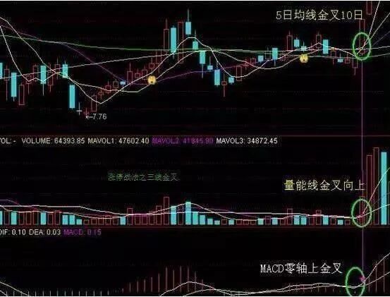 三线金叉指的是均价线、均量线、MACD。三者发出金叉信号。三者同时发出的金叉信号是非常强烈的买入信号。一买就涨!在技术分析中“价、量、时、空”这四大要素中有三个发出了买入信号,极大提高研判准确性的概率。一旦出现三线金叉形态,买入就能享受到快速拉升的机会。