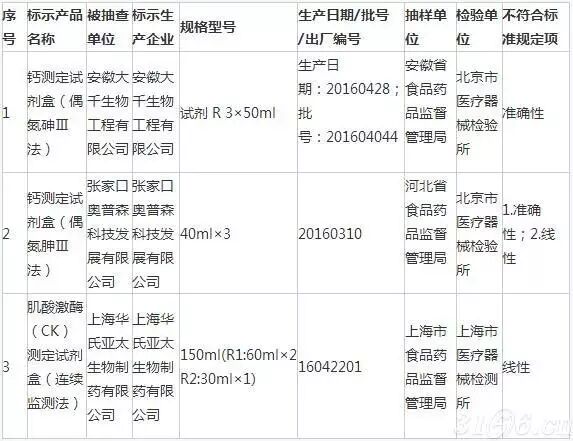 (一)钙(Ca)测定试剂盒2家企业2批产品。安徽大千生物工程有限公司生产的1批钙测定试剂盒(偶氮胂Ⅲ法),准确性不符合标准规定;张家口奥普森科技发展有限公司生产的1批钙测定试剂盒(偶氮胂Ⅲ法),准确性、线性不符合标准规定。