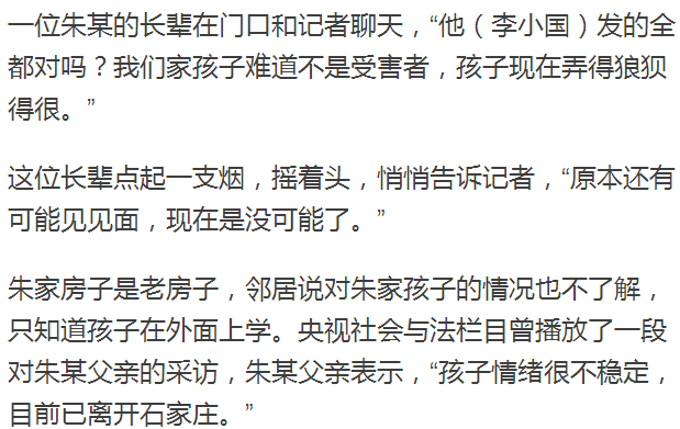 12月9日,记者来到位于河北衡水的朱某家中。对于李小国曝光此事的行为,朱某父亲异常愤怒,谁若提这件事他就要骂人。“他发的全都对吗?我们家孩子难道不是受害者,孩子现在弄得狼狈得很。”一位朱某的长辈告诉记者,“原本还有可能见见面,现在是没可能了。”