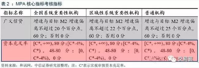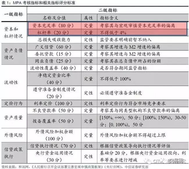 根据央行规定,MPA评估包括7大类的考核标准,各100分,其中“资本和杠杆情况”一类包括宏观审慎资本充足率80分,杠杆率20分。