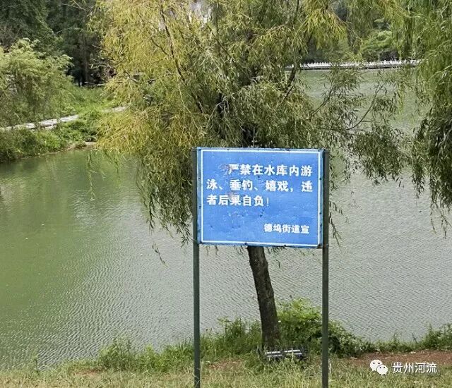 德坞水库全天对外开放,为了游客的安全,湖边设置了禁止游泳的警示牌,提醒游客注意安全。德坞水库湖水从这里流淌到白鹤村河段,河岸边是民宅,未发现周边有垃圾和污水排放。因条件受限,未能对此区域水质进行检测,但通过肉眼观察到湖水水质较好,河岸边绿树成荫,自然环境较为良好。