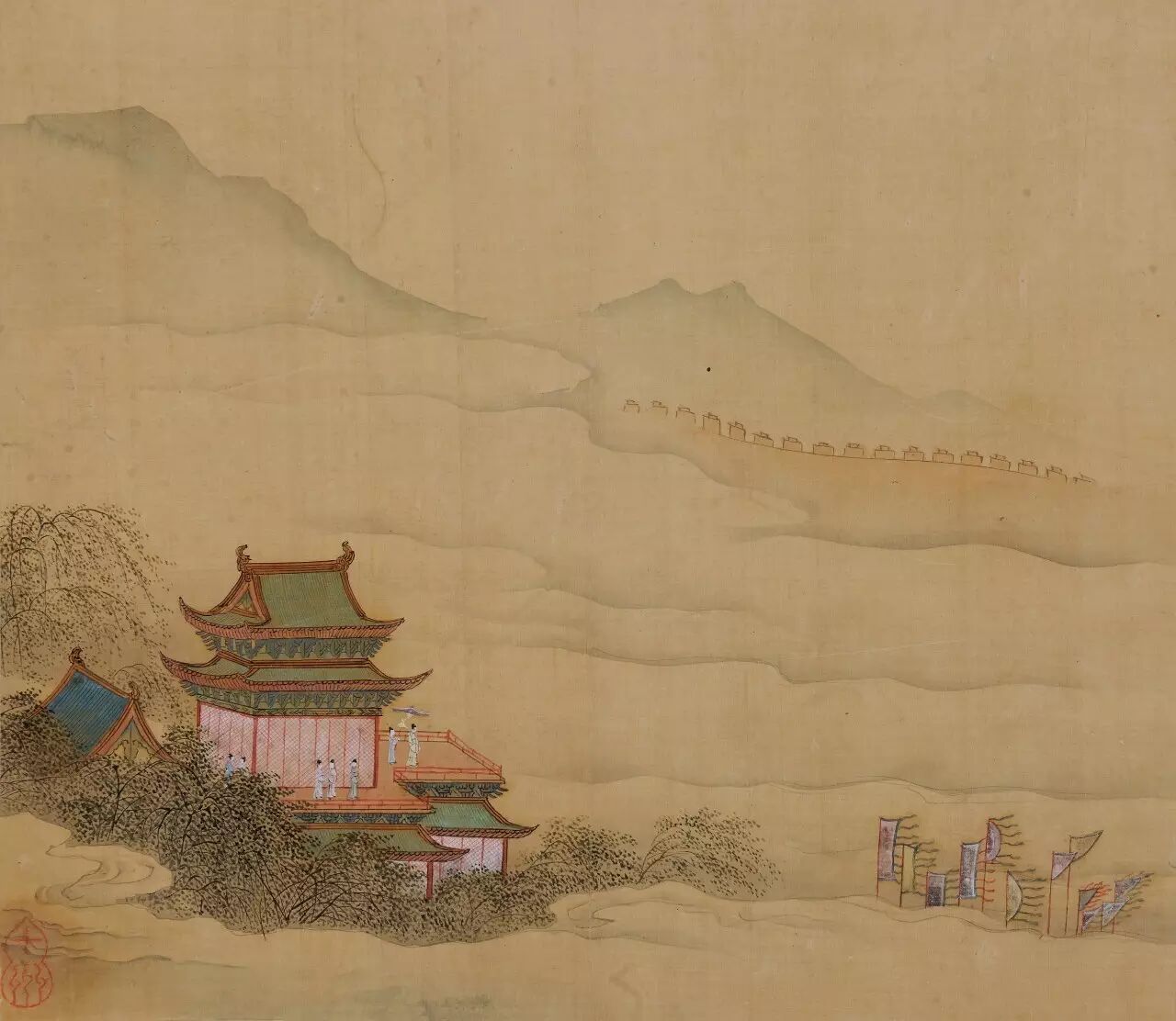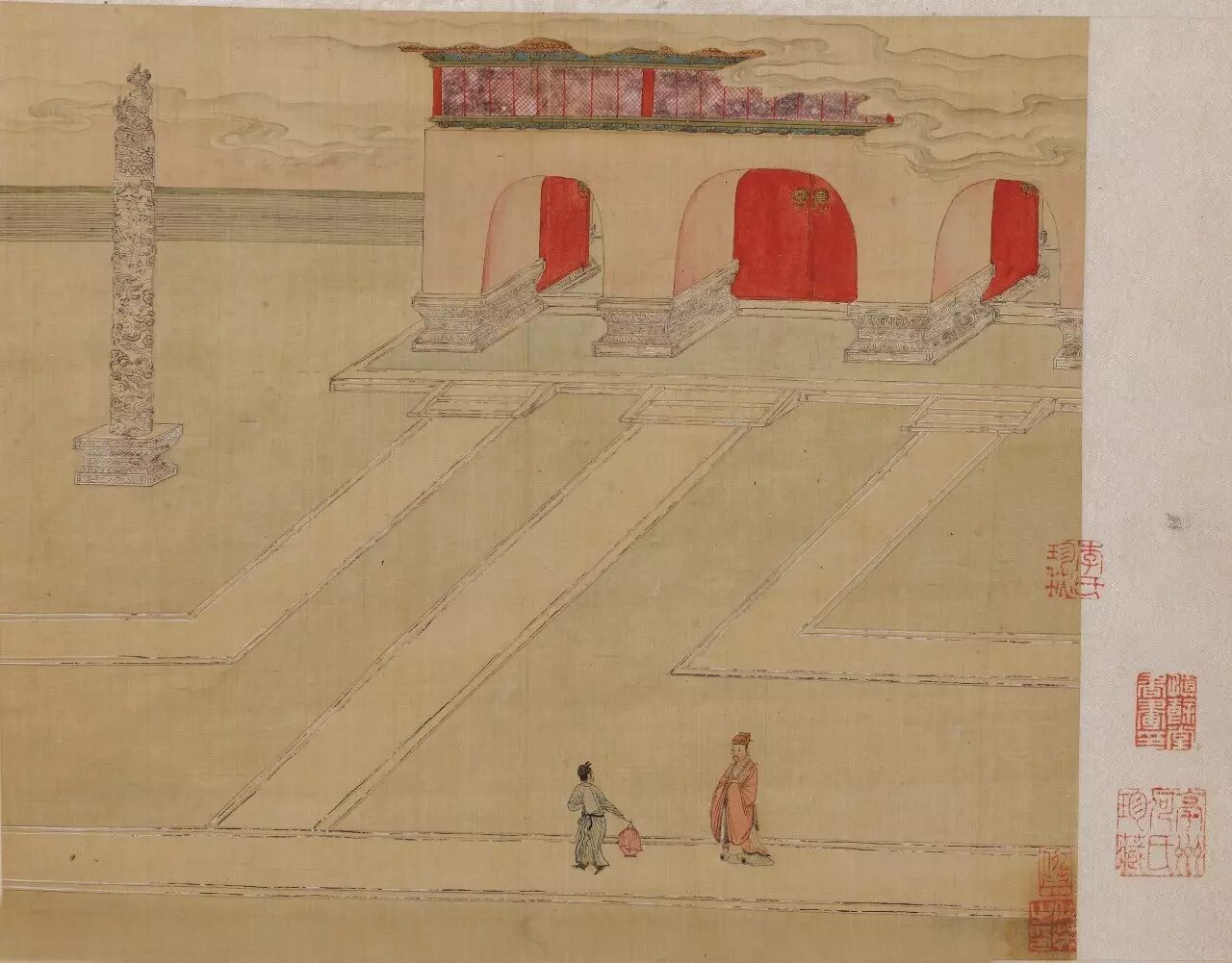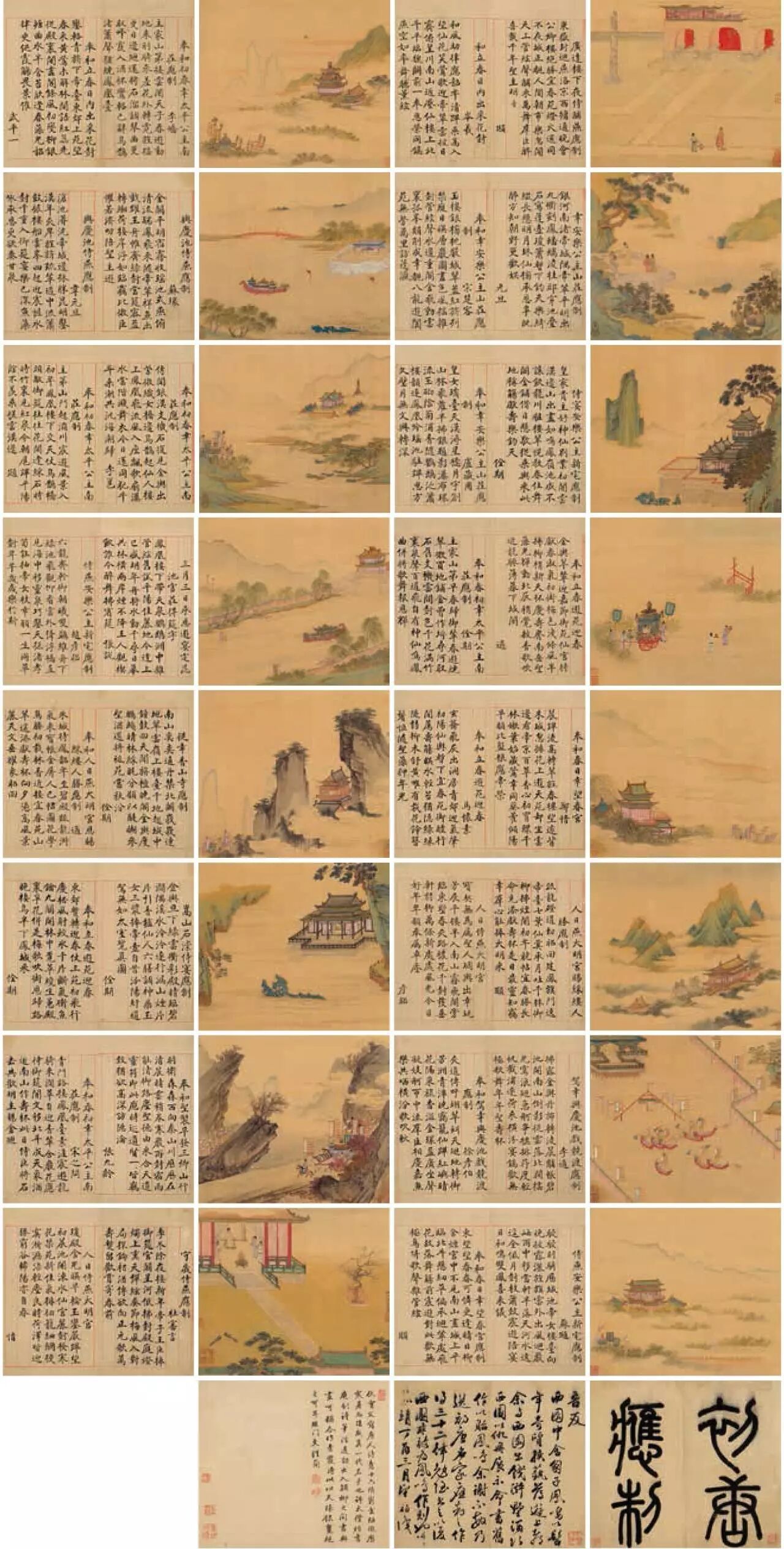 明仇英绘《唐人诗意图册》,设色绢本,共计十六开,每开纵24厘米,横27厘米,图绘四季时节帝王出游及行宫游乐题材,按图意依次为:“早朝入宫”、“卤簿云楼”、“帝王眺瞩”、“龙舟登阙”、“帝王览胜”、“云楼旌旗”、“御道行辇”、“端楼迎春”、“登楼望峰”、“青山云楼”、“楼船泛舟”、“帝王筵宴”、“龙舟竞渡”、“天子驾六”、“城堞赏春”、“琼殿迎新”。最后一图末尾有“仇英实父堇制”文字题款,每幅均有印章或一枚,或二枚,三枚不等。对幅有许初(公元16世纪)楷书题初唐应制诗三十二首,笔法出于颜柳之间,与绘画相得益彰,并篆书题引首“初唐应制”。册后有许初、文从简(1574 -1648)、许乃普(1787-1866)三人题跋。此册迭经明·王一鹏(生卒不详)、明·顾凝远(1580 -1645后)、清·何溥(19世纪)、清·李恩庆(?-1864)、清·许乃普(1787-1866)等人递藏。著录、出版先后见李佐贤《书画鉴影》卷十四, 1936年原田谨次郎编著的《中国名画宝鉴·明》与1985年艺术图书公司出版的《吴门画派》一书。全册格度严谨,精工巧丽之极,设色、山石、林木、人物,“资唐宋名家之长而浑合之”,种种臻妙,既有宋院体画的写实笔墨基础,又有文人画清雅脱俗的情怀气质。所用材质极为讲究,绢丝织造细密匀净,几近宫中“贡绢”,故本册具有极高的历史和艺术价值。书画鉴定大师徐邦达先生评仇英作品:“真笔不论粗细,无不具有文秀之致”。是品鉴本册绘画面貌的真实写照。