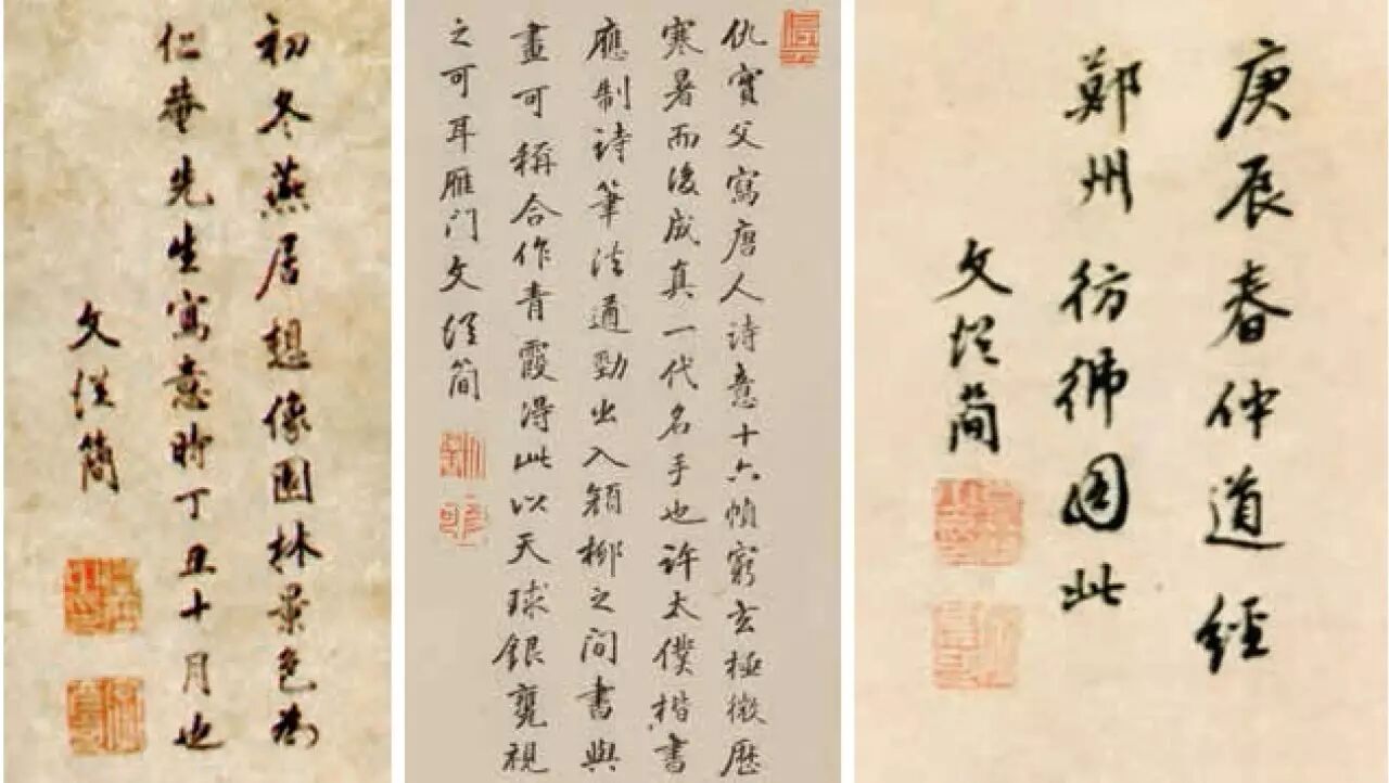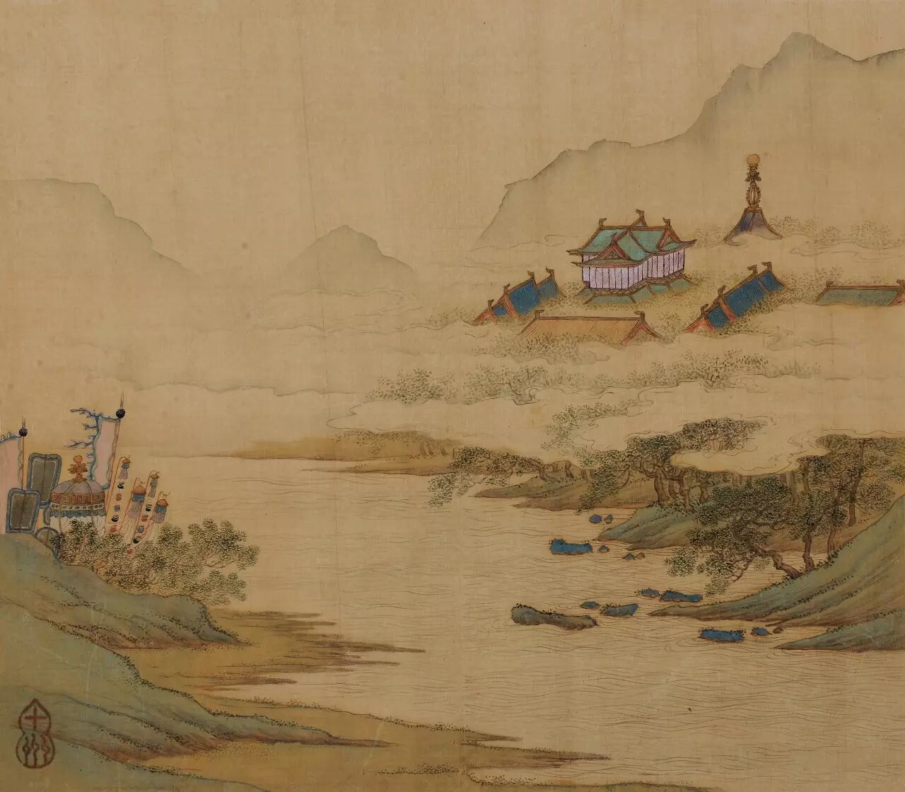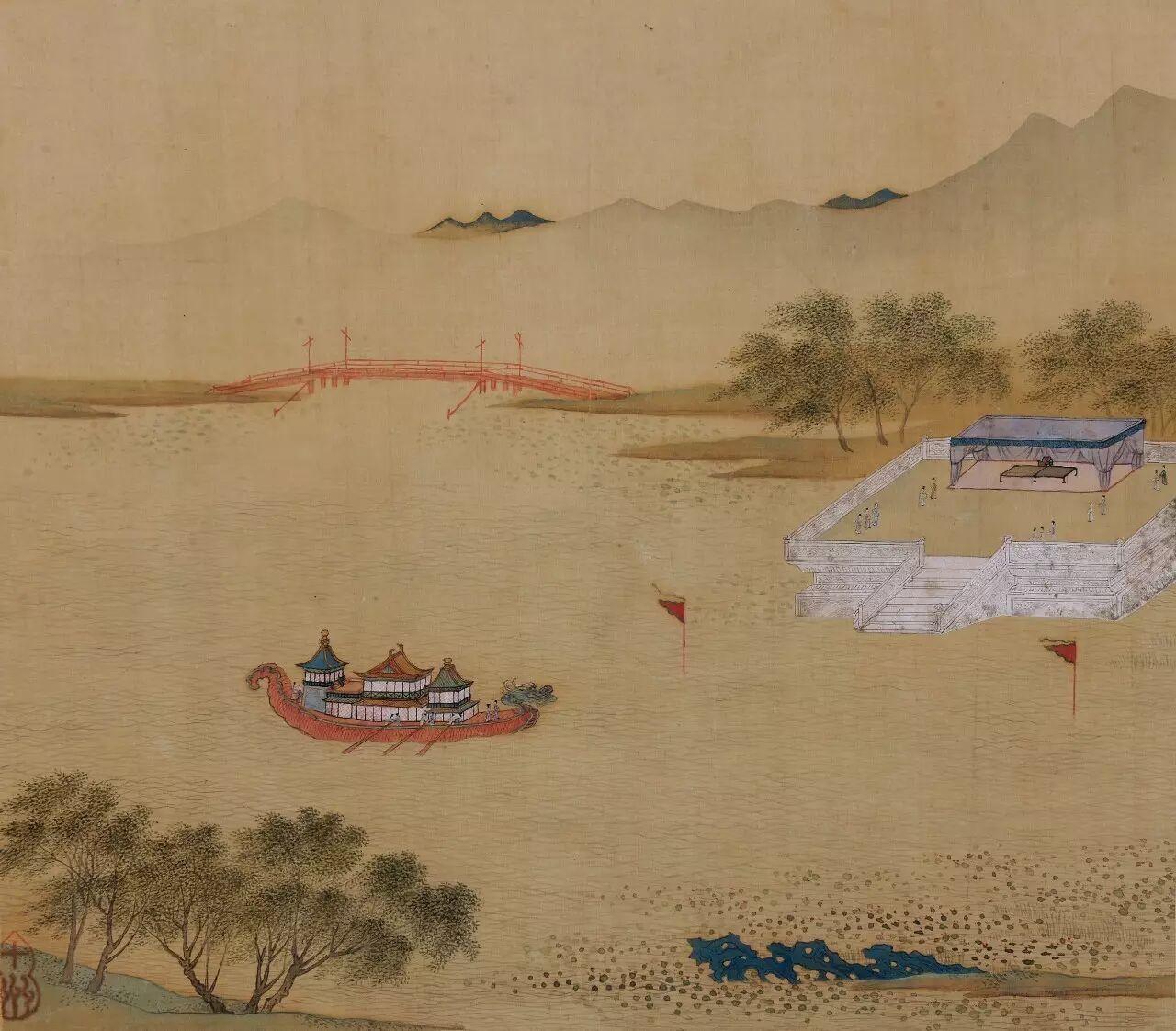 明仇英绘《唐人诗意图册》,设色绢本,共计十六开,每开纵24厘米,横27厘米,图绘四季时节帝王出游及行宫游乐题材,按图意依次为:“早朝入宫”、“卤簿云楼”、“帝王眺瞩”、“龙舟登阙”、“帝王览胜”、“云楼旌旗”、“御道行辇”、“端楼迎春”、“登楼望峰”、“青山云楼”、“楼船泛舟”、“帝王筵宴”、“龙舟竞渡”、“天子驾六”、“城堞赏春”、“琼殿迎新”。最后一图末尾有“仇英实父堇制”文字题款,每幅均有印章或一枚,或二枚,三枚不等。对幅有许初(公元16世纪)楷书题初唐应制诗三十二首,笔法出于颜柳之间,与绘画相得益彰,并篆书题引首“初唐应制”。册后有许初、文从简(1574 -1648)、许乃普(1787-1866)三人题跋。此册迭经明·王一鹏(生卒不详)、明·顾凝远(1580 -1645后)、清·何溥(19世纪)、清·李恩庆(?-1864)、清·许乃普(1787-1866)等人递藏。著录、出版先后见李佐贤《书画鉴影》卷十四, 1936年原田谨次郎编著的《中国名画宝鉴·明》与1985年艺术图书公司出版的《吴门画派》一书。全册格度严谨,精工巧丽之极,设色、山石、林木、人物,“资唐宋名家之长而浑合之”,种种臻妙,既有宋院体画的写实笔墨基础,又有文人画清雅脱俗的情怀气质。所用材质极为讲究,绢丝织造细密匀净,几近宫中“贡绢”,故本册具有极高的历史和艺术价值。书画鉴定大师徐邦达先生评仇英作品:“真笔不论粗细,无不具有文秀之致”。是品鉴本册绘画面貌的真实写照。
