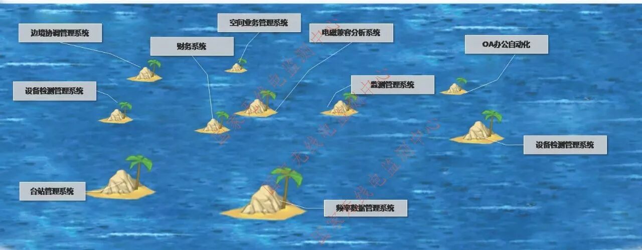 这些问题从信息化的角度来看,就是典型的“信息孤岛”现象(图7):行业内大量的软件系统,业务上紧密关联,但相互之间如漂浮的孤岛,可见却不可通,不同业务之间的信息仍然是相互孤立的。这些问题的存在和解决方式,不是单纯的监测、检测、台站和卫星等技术可以解决的,而是通过信息化手段来实现。所以,这种信息化手段就是我们无线电管理一体化的核心。