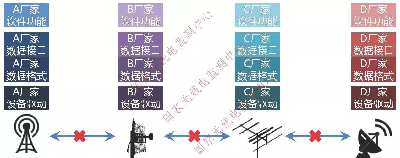 监测业务是无线电管理最为典型的业务场景,如图3所示,监测系统通常会包含天线、接收机、设备驱动、数据格式、数据接口和软件功能等模块,传统模式下这些模块都是由一家厂商开发完成,这就会形成软硬件“捆绑”的情况。如果要实现设备的互联互通,需要打破设备驱动、数据格式、数据接口和软件功能之间的衔接,协调、改造和运维的成本将是巨大的,尤其是随着设备种类和数量的增加,传统模式下的互联互通几乎会成为一种不可能。