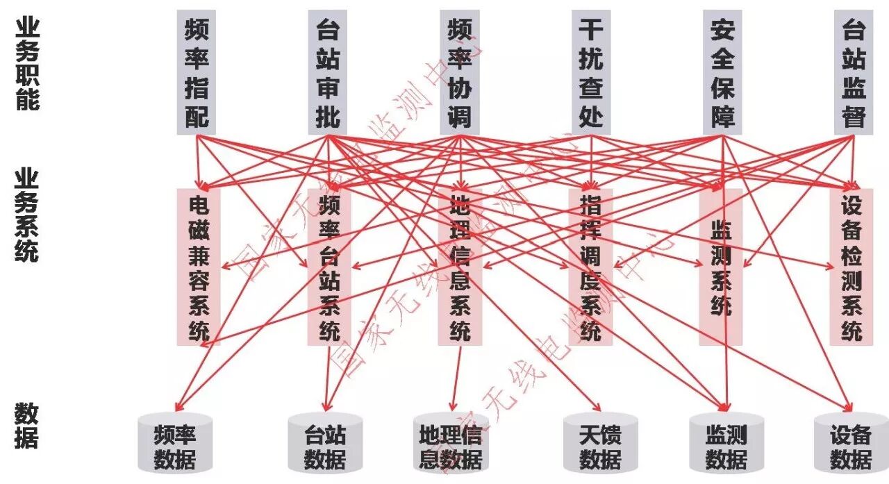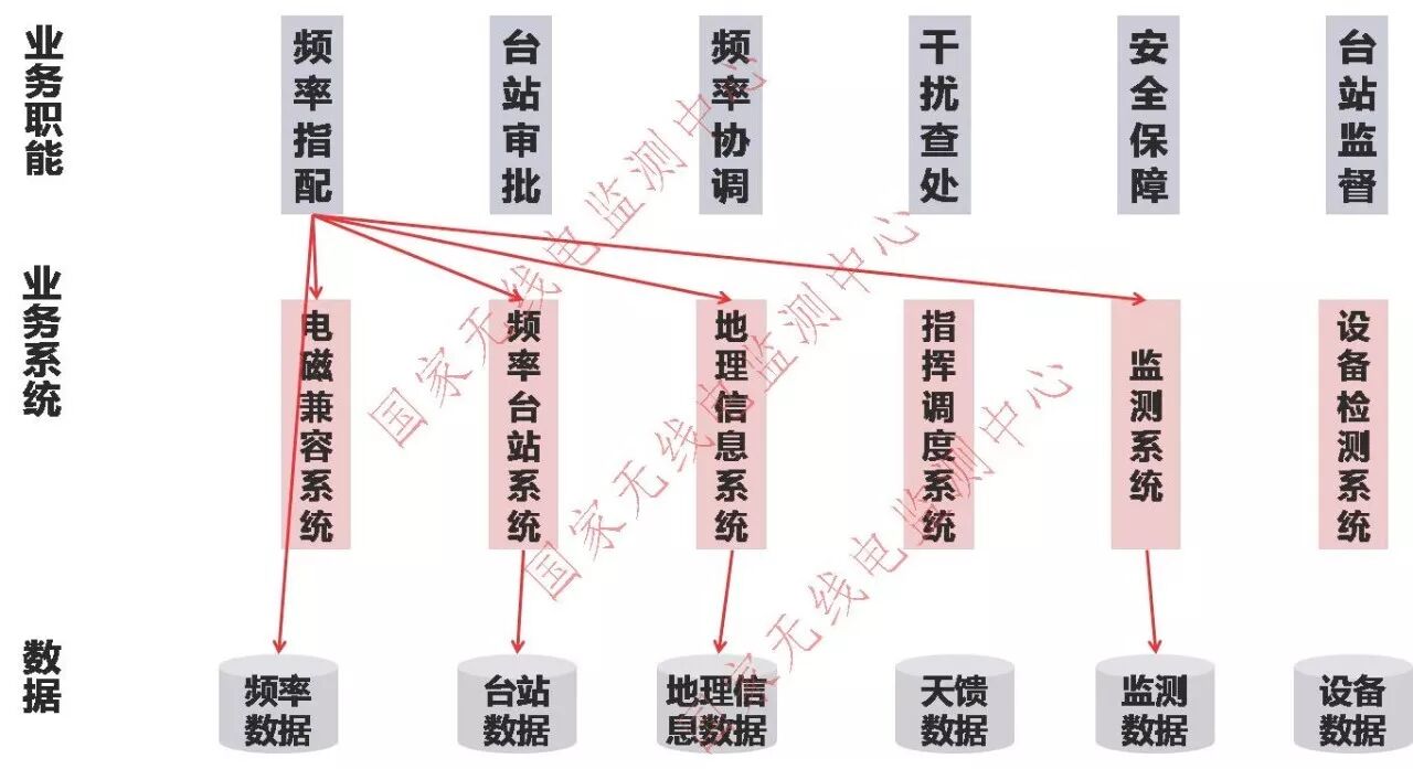 接口混乱是无线电管理全业务数据共享所面临的一个突出问题。如图5所示,我们的业务职能有很多(频率指配、台站审批、干扰查处等),相应也会建设许多业务应用系统,例如EMC系统、频率台站系统、地理信息系统、监测系统和设备检测系统等等,这些系统的后端又需要频率、台站、地图、监测和设备等数据库的支撑。在传统运作模式下,频率指配业务职能的实现需要分别的、独立的调用中间层的多个业务应用系统和底层的多个数据库系统,如图5红色箭头所示。我们设想一下,当所有业务职能都在传统模式下运作时会是什么样的场景。