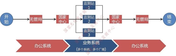 流程断裂主要是指无线电管理中行政流程和技术流程割裂的情况。以国家中心短波查干扰为例(图4),通常一个任务从部无管局下发到国家中心是走行政流程(红色部分),国家中心执行具体任务时,会下发给相关的多个监测站,由监测站通过专业监测软件来执行,即技术流程(蓝色部分)。等所有监测站执行完监测任务后,需人工提交电子文档给国家中心,国家中心再通过行政流程反馈给部无管局。可以发现红色的行政流程和蓝色的技术流程是割裂的,因此会导致:1)监测任务人工下达和上报;2)任务执行进度不清楚;3)设备使用权限需多部门人工干预;4)一线监测人员在多套监测系统之间切换操作。