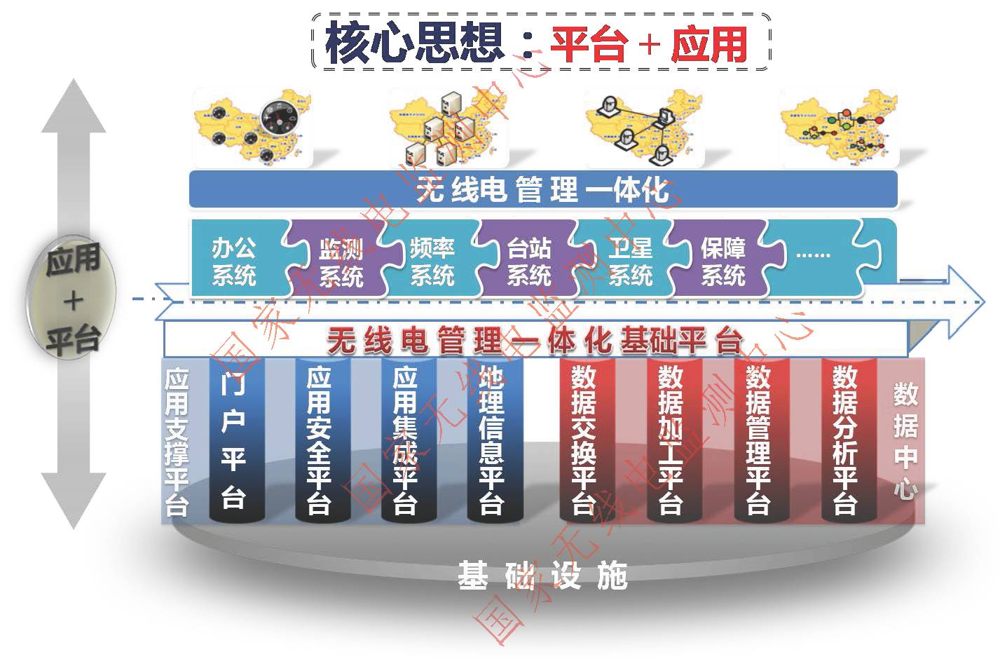 ★ 无线电管理一体化平台(简称“一体化平台”):以“平台+应用”为核心思想,以SOA(面向服务体系架构)为技术架构,以先进信息化技术搭建的通用软件平台,是实现无线电管理一体化战略的信息化“工具”和“舞台”,是一体化战略的核心落地实现。
