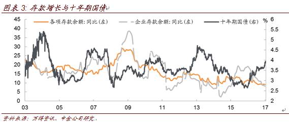 在13年之前,国债利率走势与企业存款增速呈现较强的同向关系。而在12年之后,银行理财崛起,存款结构发生了非常大的变化,大量的一般存款转化为非银同存等,存款与利率走势的关系变得更为复杂。