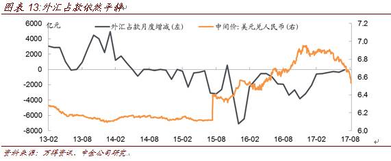 外汇占款的分析也应该抛弃旧有的思维方式。预期明显弱化有助于外汇占款的恢复。但疑问是前期人民币明显升值为何还是没有带动外汇占款的回流?人民币走强+央行强力干预=外汇占款快速增加。目前的情况呢?美元弱、逆周期因子、限制流出贡献大。尤其是央行退出日常干预,导致外汇占款未见明显增加。