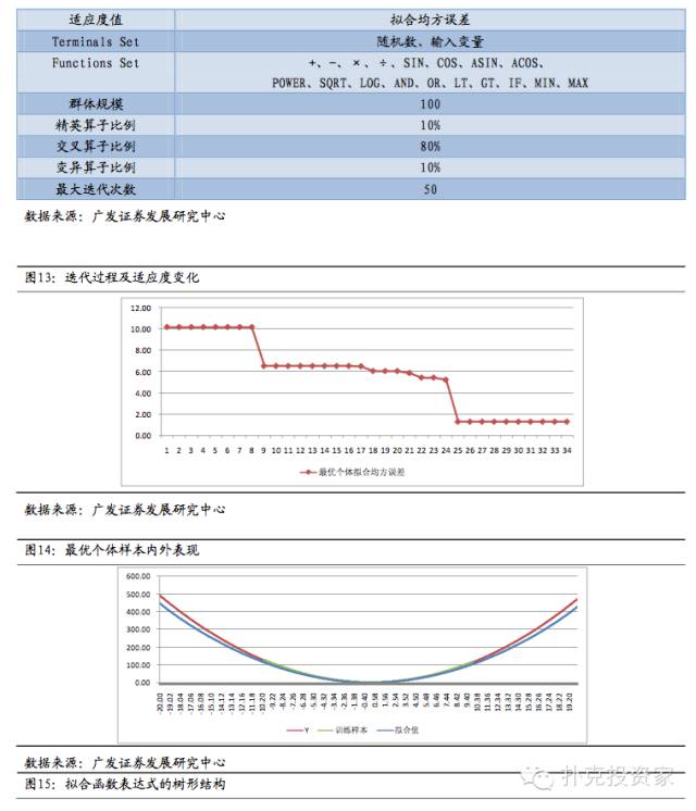 在遗传规划算法上,我们进行了如下设置,分别有函数集、终端集、群体规模、迭代次数、遗传算子相关的参数,如下表。 图13是算法迭代过程,可以看到随着迭代的推进,最有个体的均方误差在不断减小,