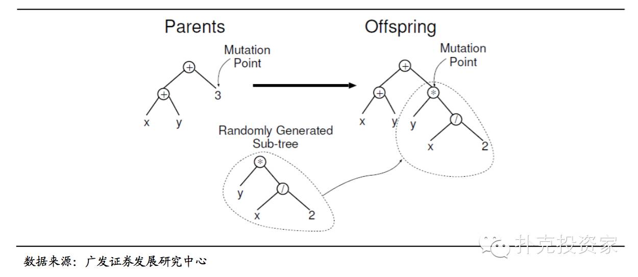 按照等比例于适应度的选择概率在上一代群体中选择一个个体作为父代,并随机选 取其树结构之节点,令随机生成的另一个树结构函数体替换以该节点为根节点的子树,