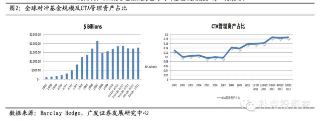根据Barclay Hedge的统计,全球对冲基金管理规模在2007年达到峰值2.13万亿之 后有了小幅度的萎缩,截止到2012年1季度的数据显示,总规模在1.76万亿,其中利用 CTA策略进行管理的资产占比却呈逐年提升态势,从2002、2003年的10%占比到目前18.6% 的比例,CTA策略已经成为全球对冲基金使用最多的一类策略。
