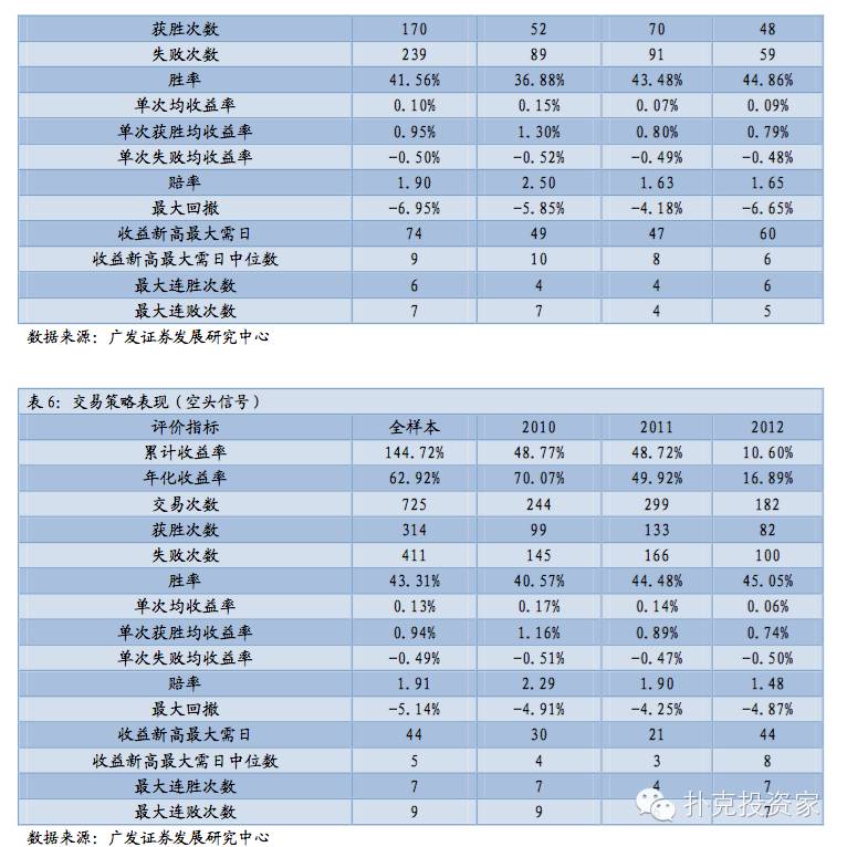 最优策略的实证结果如下,全样本来看,年化收益率为116%,胜率为42.68%,赔率 为1.91倍,历史最大回撤为-8.2%,分年度来看,2010、2011、2012年化收益率分别为 118%、67%、34%,胜率分别为39%、42%、45%,赔率分别为2.36、1.80、1.54,最大回 撤分别为-6.18%、-7.48%、-8.09%,交易次数方面,每年交易在400次左右,平均每天 1.6次。