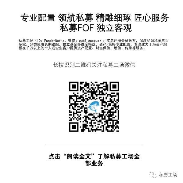 私募工场(ID:Funds-Works,微信:guo5_guoguo):实名注册会员数万,深度尽调私募三百多家,分类策略长期跟踪,独立基金多维度筛选,资产/策略专业配置。专注致力于为资产规模在千万以上的个人或企业客户提供资产配置、财富保值、增值、传承等服务。
