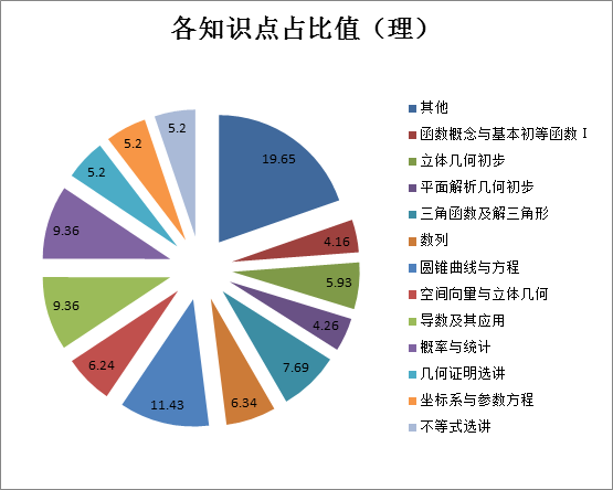 3、函数概念与基本初等函数Ⅰ/平面解析几何初步,推理与证明题,占比4%左右;其余知识点年均占分约为一道选/填题的分值5分;