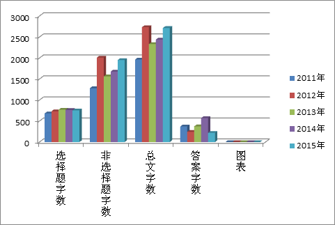 由上图可以看出,2011年-2015年的文字数,除2012年外,数量有逐年上升的趋势,希望同学们加大生物试题文字阅读能力的提升。