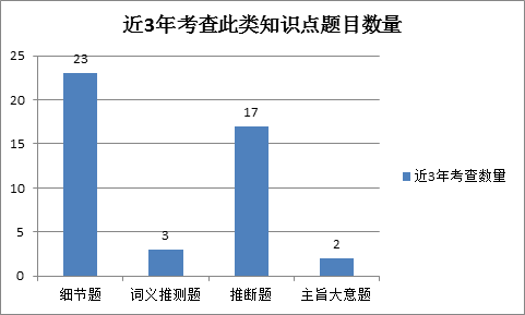 由上图可知,近3年英语阅读理解以细节题和推断题为主;词义推测和主旨大意两类题型考查较少,每年一种题型一道或无。