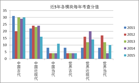 近年来,中国古代和中国近现代考查分值较高,其次是世界近现代和世界当代模块。
