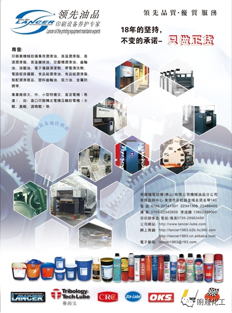 是一种纯度极高的链条润滑油,使用时无需大量涂抹于链条上,从而可减少喷粉聚积,减少清洗链条的需要。性 能:具有极强的粘著力和热稳定性,并具有良好的渗透性,特别适用于高、低温链条润滑。内含极压抗磨添加剂能承受重载,油品表面张力较低,因而具有优异的渗透性,可渗入链条轴等细小的鏠隙。本品还可用于高温轴承及齿轮的润滑。适用于:德国KBA(高宝)印刷机,自动模切机等设备高速链条及自动供油系统。可以直接代替OKS340链油,性价比高。
