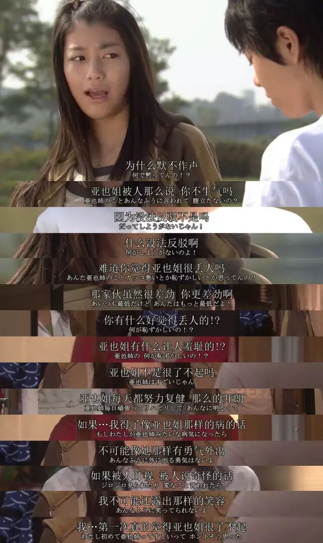 亚也的弟弟弘树起初因为同学们嘲笑自己的姐姐是残疾人而感到羞耻,亚也的妹妹亚湖虽然平日里因为各方面都不如亚也而有很多不满。但这时,她却说了这些话。