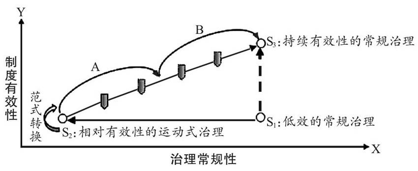 学界在讨论运动式治理时普遍存在一个误区,即笼统地将常规治理作为一个整体,而未做进一步细分。事实上,常规治理并不一定就是持续有效的,还有可能是低效的。为此,国家治理至少包括三种状态,见图1:S1,低效的常规治理,是国家治理范式的糟糕状态;S2,相对有效性的运动式治理,是国家治理范式的过渡状态;S3,持续有效性的常规治理,是国家治理范式的理想状态。那么,国家治理范式的良性转换大致有三条可能性路径:其一,从低效的常规治理向持续有效性的常规治理转换,是国家治理范式转换的最理想途径。但如图1所示,持续有效性的常规治理必须以较高的制度有效性为前提。由于历史与现实诸多因素的影响,中国国家治理中制度有效性供给始终未能满足日益复杂的公共事务及公共服务需求。为此笔者认为,中国尚不具备直接转换为持续有效性常规治理范式的客观条件。其二,在制度有效性不足或无法持续供给的现实情况下,中国在漫长的革命和建设历程中,探索出第二条国家治理范式转换的路径,即由低效的常规治理走向相对有效性的运动式治理范式。经过革命和建设历程的漫长积累,这一范式的形成和发展,体现出典型的“路径依赖”特征。其三,由于运动式治理存在诸多内在缺陷,从相对有效性的运动式治理走向持续有效性的常规治理,依然是中国国家治理“范式转换”的理想追求。同样,在此过程中,制度有效性依然至关重要,就像预先设定了轨迹的“调节阀”。当“调节阀”处于A段时,更接近相对有效性的运动式治理;随着制度有效性的提升,状态阀会沿着斜向轨迹逐渐向右上滑动;当“调节阀”进入B段时,更接近持续有效性的常规治理。