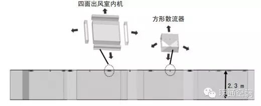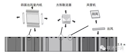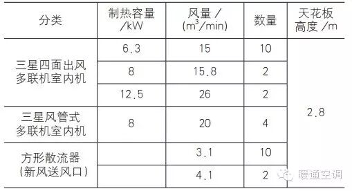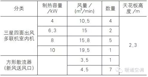 室内侧制冷制热使用多联机四面出风式室内机组 ;新风引入采用 DVM 全新风系统(多联机室外机+全新风室内机组)。
