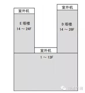 3)空调配置 :数码涡旋多联机组 DVM PLUS III(5 500 匹);室外机共有 3 组安装位置,分别是 14 层屋顶,E 塔楼屋顶(25 层),D 塔楼屋顶(27 层)。