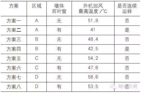 分析:①女儿墙无百叶窗的情况 :所有区域室外机均存在气流短路现象,每个区域均有室外机回风面温度超过连续运转温度 43 ℃上限,故室外机会有大量无法连续运转的情况出现;②女儿墙玻璃窗改为百叶窗后 A,B 区域室外机可以连续运转 ;③女儿墙玻璃窗改为百叶窗后 C,D 区域,有部分室外机回风温度超过连续运转温度 43 ℃上限,依然无法连续运转 ;④ C,D 区域部分室外机需移机,同时加大中心部室外机间距,重新进行气流分析。