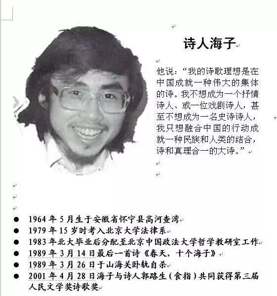 1989年3月26日,25岁的海子在山海关附近从侧面冲到一辆火车车轮下,事发地点在北京东数百公里处,靠近大海。他身上携有一张便笺:
