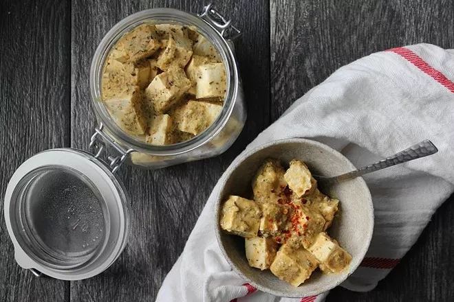 北豆腐一块,有机细味噌酱1大勺,鲜柠檬汁半个,苹果醋1大勺,橄榄油1大勺,水3大勺,营养酵母粉2大勺,盐1/4-1/2小勺,黑胡椒适量,红辣椒适量