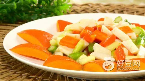 1、将小南瓜一开二挖去内瓤,切成三角形的块。芦笋切菱形丁,胡萝卜切菱形丁,去好皮的山药切菱形丁。