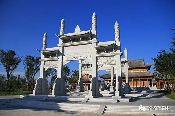 穿过公园南大门,顺着移民文化轴的起点进入园区,一座棱角分明的风水桥映入眼帘,仔细看来,颇有几分故宫金水桥的味道,整个桥面由3个拱桥组成,桥头雕有看护神兽,形态各异,甚是精致。不远处高12.5米的入口牌坊与其遥相辉映,八柱五间七楼式结构,全部采用麻城本地花岗岩建成。牌坊正面匾额“奉先继序”,寓意子孙后代要侍奉先祖,承继先代功业。