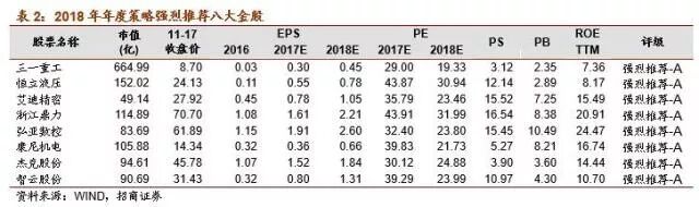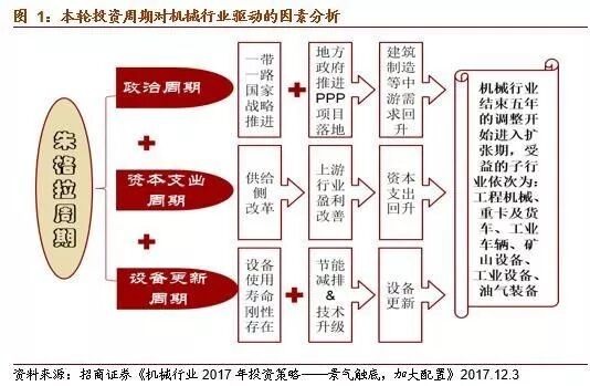 展望2018年,机械行业复苏已一年,行情是否还能继续?历史经验显示一个中周期的复苏3年左右,这与政策落地周期、基建投资项目周期(通常3-5年),企业销量回升到盈利改善再到资本开支回升形成正反馈至少也是两年以上,尤其是2018年,十九大后的第一年处于一个政策落地的执行期,供给侧改革淘汰落后产能和《中国制造2025》政策落地,中国将开展新一轮大规模重大技术改造升级,这些政策均有利于高端装备,尤其是行业龙头企业。因此,我们维持2018年机械行业仍处于朱格拉周期扩张期的判断:政策周期+资本开支回升周期+更新周期三周期叠加。