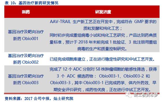 在基因治疗和靶向药物开发方面,公司与中国医学科学院、武警总医院等单位达成合作协议共同进行病毒载体应用于疾病模型构建和靶向治疗肿瘤药物的开发。目前公司重点推进 Obio001、Obio002 及 Obio003 三款基因治疗及靶向治疗新药研究。
