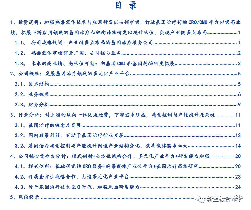 1、投资逻辑:加强病毒载体技术与应用研发以占领市场,打造基因治疗药物CRO/CMO平台以提高业绩,拓展下游应用领域的基因治疗和靶向药物研发以提升估值,实现产业链多点布局