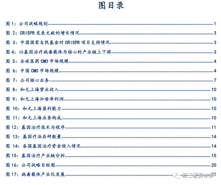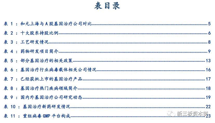 和元生物技术(上海)股份有限公司(和元上海,证券代码:839702)以基因治疗病毒载体研发、生产与应用转化为核心业务,主要是提供病毒载体工具设计和制备服务,疾病模型设计、构建和药物筛选服务;以提供基础科研服务和基因治疗研究CRO服务的整体解决方案为基础业务,积极向基因治疗和靶向药物研发与基因治疗药物CMO领域拓展,打造产业链多点布局的基因治疗服务公司。